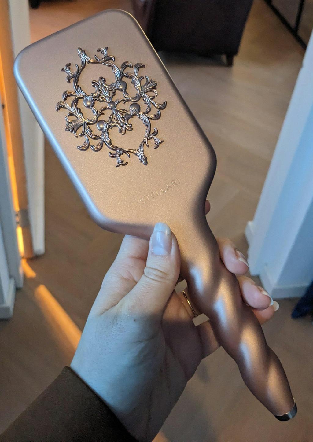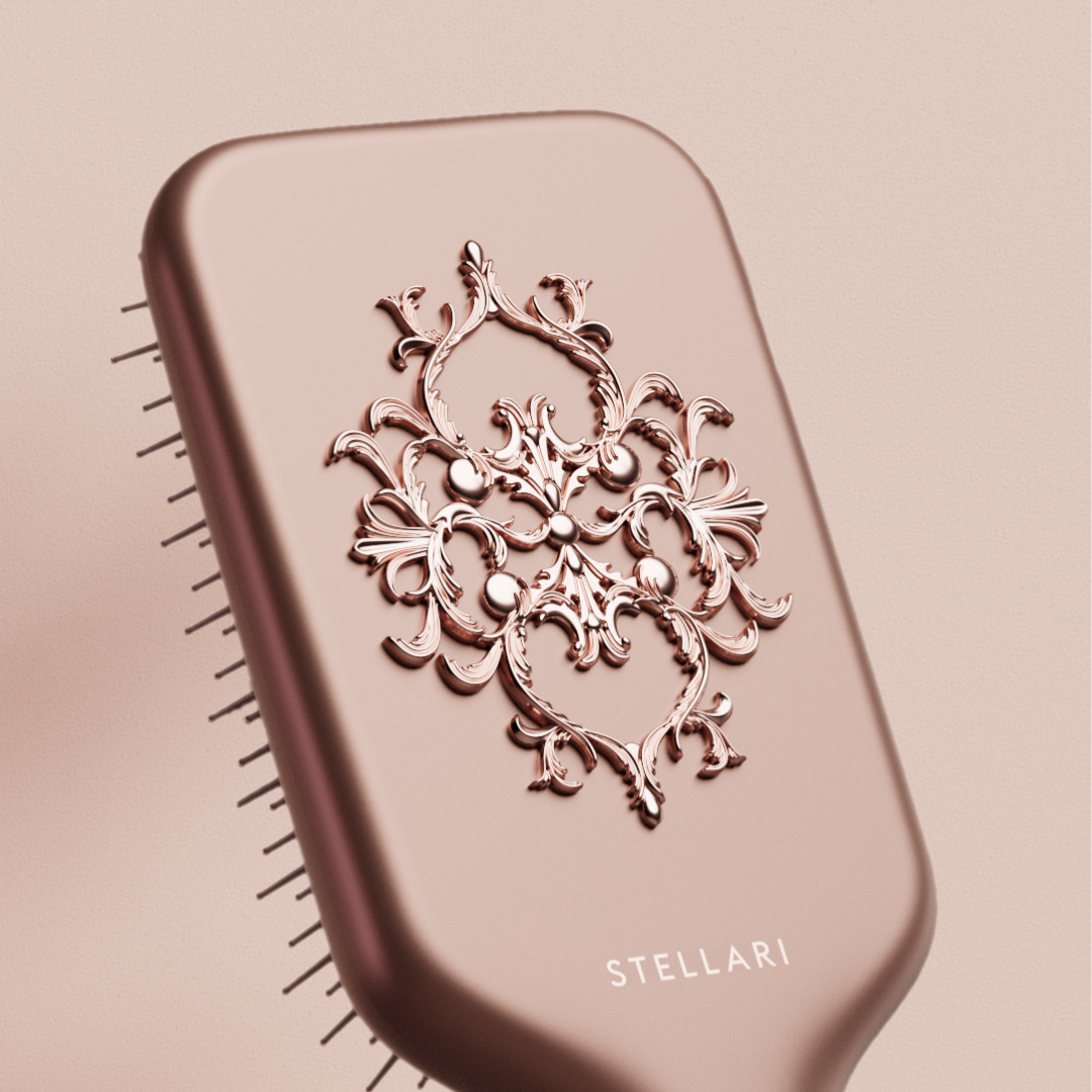 For those who love soft elegance, the Angelika Premium Paddle Brush is a perfect blend of grace and performance. With its signature twisted handle, delicate gold accents, and radiant rose gold finish, it adds a touch of warmth and beauty to every styling routine.